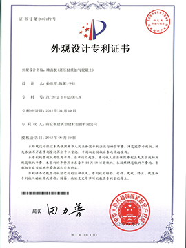 2012 外觀設(shè)計專利證書 墻面板(蒸壓輕質(zhì)加氣混凝土)